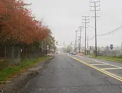 Upon entering Colts Neck Township, the road comes to an interchange with Route 18. CR 537 continues past Colts Neck High School, along with more homes, and passes Hominy Hill Golf Course to the south in the Bucks Mill section of the township, before coming to the intersection with Route 34. At this intersection, CR 537 becomes unsigned and heads into agricultural areas. After passing under Normandy Road, which serves as a road and railroad link between the two sections of Naval Weapons Station Earle, the route heads northeast through a mix of farms and housing developments. Upon intersecting with Swimming River Road (CR 50), CR 537 heads into Tinton Falls and turns southeast onto Tinton Avenue. The road enters wooded areas of homes, coming to the intersections of Sycamore Avenue (CR 13A) and Wayside Road (CR 38). After the latter intersection, the route turns east and passes over the Garden State Parkway. The road passes more homes before crossing the intersection with Hope Road (CR 51) into Eatontown. In this area, CR 537 passes more development and crosses the Southern Secondary railroad line operated by the Delaware & Raritan River Railroad before intersecting with Main Street (Route 35) at the former entrance to Fort Monmouth.[1] The route enters the former military base on a road known as the Avenue of Memories. On this portion, the road is lined by trees and memorials to U.S. Army Signal Corps soldiers killed during World War II. It enters Oceanport still within the confines of Fort Monmouth traveling along Saltzman Avenue and Hildreth Avenue before ending at a signalized intersection with Oceanport Avenue (CR 11).[3][4]