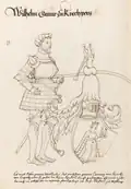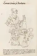 • Conrad of Kirchberg: Konrad is shown on the miniature 24r of the Codex Manesse as a knight (Graue Chunrat vo Kilchberg) who is giving his beloved a poem on horseback. 22 stanzas have survived, divided into three summer and three winter songs, which are reminiscent of Neidhart and Tannhäuser in terms of motif and form.[7] The historical person is uncertain; it is either Konrad (documented between 1255 and 1268) or his son of the same name (documented between 1286 and 1315).[7]