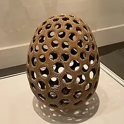 Artifice, 2016. Micaceous clay with glaze. This sculpture is a hollow medium-sized oval that has holes perforating its entire surface. The artwork is meant to resemble man-made artificial reef structures.