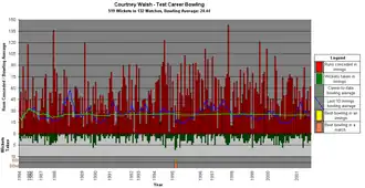 A graph showing Walsh's test career bowling statistics and how they have varied over time.