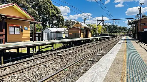 Cowan station was opened in 1890.[3] The station was a terminating point for CityRail suburban services until January 1992 when all services were curtailed to Berowra.[4] A southbound passing loop is located immediately south of the station. In February 1999, it was extended south 1.1 kilometres (1 mi) to allow 1.5-kilometre (1 mi) freight trains to stable.[5] North of the station the 8.6-kilometre (5 mi) Cowan Bank commences its descent to Hawkesbury River station and thereafter, crossing the Hawkesbury River.