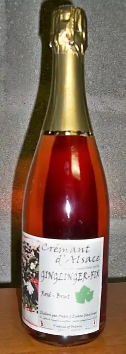 Crémant d'Alsace (French pronunciation: [kʁemɑ̃ dalzas]) is an Appellation d'Origine Contrôlée for sparkling wines made in the Alsace wine region of France. Produced since 1900, the Crémant d'Alsace AOC was recognized in 1976 by the INAO and the designation Crémant regulated by the European Parliament in 1996.[1]