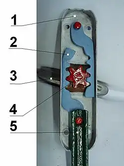 Shown from the rear, the parts of the crémone bolt gearbox (1) includes the lever or knob (3), which rotates the pinion gear (4), engaging the pair of rack gears (2), which push the two half-round bars (5) upward and downward at the same time (only the bottom bar is shown), into the sockets.