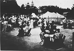 Upon the asphalt tennis court small tables for afternoon tea were set, each table enhanced by the addition of its vase of flowers and the whole was presided over by a bevy of pretty girls in white frocks and black picture hats their distinguishing colours being huge bows of pale blue satin ribbons placed on the corsage. Down the hill towards the Rose Bay Road some dozen marquees were erected and these were furnished with gaily-draped stalls laden with the most attractive articles tempting to the would-be purchaser.