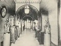 "The interior posses many costly art treasures - rare china of Dresden, Meissen, Sevres, and Vienna manufacture, also from Worcester and the potteries of England. In the drawing room there may be seen a magnificent specimen of ivory carving - a female figure carved from a block of ivory fully two feet long. Pictures by Italian, German and English artists decorate the walls."
