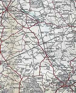 All local trains plying between Ormskirk and St Helens called at Rainford Junction, entailing a reverse. None used the 'direct line' between Bushey Lane Junction[9] and Randle Junction[10] which formed the third side of the triangle shown near the top of the route diagram. That stretch was the preserve of goods trains, diversions and occasional specials.[11]