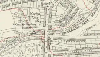 The branch line from the Great Northern Railway's (GNR's) station at Highgate to Alexandra Palace was built by the Muswell Hill Railway (MHR) and opened on 24 May 1873.[1] Cranley Gardens station opened on 2 August 1902.[2] In 1911, the line was taken over by the GNR. After the Railways Act 1921 created the Big Four railway companies, the line became part of the London & North Eastern Railway (LNER) from 1923. The LNER closed the station on 1 December 1930 and reopened it in July 1932.[2]