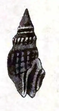 (Original description) The jet-black shell is acuminately pyramidal. The upper part of the whorls is flat and slightly knobbed near the suture. The lower portion is finely striated transversely, ribbed longitudinally, the ribs curved and rather wide apart. The aperture is oblong. The siphonal canal is rather long and a little reflected.[2]
