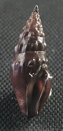 (Original description) The solid shell is livid purple under a very dark olive periostracum. It consists of about six whorls exclusive of the (lost) protoconch. The suture is strongly appressed behind a constricted anal fasciole. The spiral sculpture consists of (on the penultimate whorl about nine) strong flattish threads, equal all over the surface and without intercalary striae. They have narrower interspaces on the spire and equal or wider ones on the body whorl. The axial sculpture consists of (on the body whorl about 10) sharp-edged narrow nearly straight ribs reaching nearly to the siphonal canal from the fasciole, with much wider interspaces. The narrow aperture is dark purple. The short anal sulcus is rounded and shows a strong subsutural callus. The outer lip is thin, slightly arcuate and smooth within, having a feeble varix behind it. The inner lip shows a thick layer of enamel, having a raised edge anteriorly. The short siphonal canal is hardly differentiated from the aperture. The siphonal sulcus is deep, forming an evident fasciole.[2]