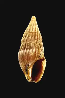 The shell of an adult varies between 10 mm and 15 mm. The fusiform shell is yellowish- or reddish-brown, sometimes partitioned over the spire whorls by a spiral line separating darker and lighter areas. The whole surface, including the sculpture, is smooth and glossy without any spiral element and is sometimes banded. The protoconch is markedly cyrtoconoid, with 2–3 smooth whorls. The five to six whorls of the teleoconch are usually somewhat round-shouldered. The shell is finely flexuously longitudinally plicate with about twenty plicae. These ribs are as broad as interspaces. They are opisthocline with a prosocline inflexion beneath the suture. The shell has a high spire with the body whorl less than half the total length. The body whorl has an inflated profile, not narrowing at all around the siphonal canal; with axial ribs attenuated towards the base. The aperture is ovate and is dirty white inside. It has a broad and very short siphonal canal. The aperture is distinctly thickened behind the outer lip in adults although without forming a delimited rib or varix. The outer lip is usually externally varicose. The edge of the outer lip shows a deep notch in the adapical part, then with a cutting edge and with a straight profile in lateral view. The columellar edge continues with the parietal edge, and is lined with a poorly developed callus. The parietal edge forms adapically a prominent callus which, in combination with the notch of the outer lip, forms a well-defined exhalant canal. The anal sinus is wide.[2][3]