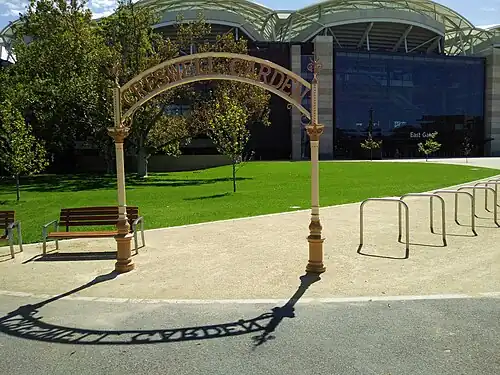 Prior to Adelaide Oval eastern stand developments, the gardens were bisected by Victor Richardson Road[2] which led to John Dowie's Victor Richardson gates.[8] The gates have now been moved to a position south-west of the oak tree, a new East gate has been incorporated into the Eastern stands structure, and the road is now the entrance to the Oval's underground car park.