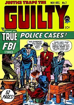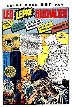 Crime Does Not Pay is an American comic book series published between 1942 and 1955 by Lev Gleason Publications. Edited and chiefly written by Charles Biro, the title launched the crime comics genre and was the first "true crime" comic book series.[1] At the height of its popularity, Crime Does Not Pay would claim a readership of six million on its covers. The series' sensationalized recountings of the deeds of gangsters such as Baby Face Nelson and Machine Gun Kelly were illustrated by artists Bob Wood, George Tuska, and others. Stories were often introduced and commented upon by "Mr. Crime", a ghoulish figure in a top hat, and the precursor of horror hosts such as EC Comics's The Crypt Keeper. According to Gerard Jones, Crime Does Not Pay was "the first nonhumor comic to rival the superheroes in sales, the first to open the comic book market to large numbers of late adolescent and young males."[2]