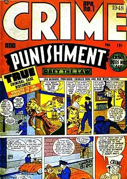 The series remained essentially alone in its choice of subject matter for most of the 1940s but eventually inspired a host of imitators, including Jack Kirby and Joe Simon's Headline Comics and Real Clue for Hillman Periodicals (1947), Marvel's Official True Crime Cases (1947), DC's Gang Busters (1947), and Fox's Crimes by Women (1948). In response, Gleason and Biro ran attack ads in their own comics and launched a companion title to Crime Does Not Pay, called Crime and Punishment, in 1948. However, 1948 also saw more publishers enter the genre, with the result that, by one estimate "thirty different crime comics were on the stands by the end of 1948 and by 1949 roughly one in seven comics was a crime comics."[7]