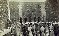 Immediately after the Bloody Week and the repression of the Paris Commune, the state had no objection to the trade in images, which enabled it to consolidate its victory over the Communards,[54] to the point that Daniel Salles described Appert as "Thiers's official photographer".[37] The images in Crimes de la Commune were widely distributed, particularly to a popular audience.[55] Several photomontages inspired by, or even differing from, Appert's are registered with the legal deposit office, including Pierre-Hippolyte Vauvray's Martyrs de la Roquette.[56]