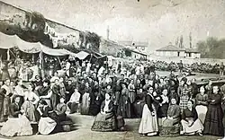 The sources of inspiration for this work are diverse. The theme of execution evokes that of the Mexican emperor Maximilian in 1867, which had given rise to an abundant photographic output, notably in "L'Exécution des otages", prison de la Roquette. Appert favors the term "assassination", and stages a group of executors, the masses, against the individual who occupies the rank of hero or martyr. For the "Massacre des Dominicains d'Arcueil," Appert drew on the codes of religious iconography, still very popular at the time due to the profusion of Epinal images. The central figure in the photomontage is clearly inspired by the martyrdom of Saint Sebastian.[30] Appert drew his inspiration mainly from contemporary published engravings, notably for his first two photomontages,[notes 8] which take their composition from engravings published in L'Illustration. Lastly, the photographer gathered testimonies from former hostages, which he endeavored to faithfully convey in his choice of details, such as Gustave Chaudey's robe, or Georges Darboy's long beard, which he added by drawing on an older portrait of the archbishop.[31] Appert also repeats a number of criticisms of the insurgents, as he had read them in the press. Maxime Du Camp's description of Communards as "obtuse brutes who understand nothing, except that they have good pay, lots of wine and too much brandy" is echoed in the image of national guards seated on terraces, indifferent to the execution they are witnessing; or in the image of the inmate of the Chantiers prison who drinks straight from the bottle. Anti-Communard imagery recurrently features stereotypes of the "obscene, hideous, ferocious" Parisian woman, the "cantinières, pétroleuses, ambulancières" that Appert portrays in "L'Assassinat de 62 otages rue Haxo," with one woman even appearing to command the shot, perched on a horse.[32]