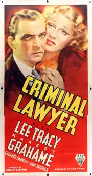 Criminal Lawyer is a 1937 American drama film directed by Christy Cabanne from a screenplay by G. V. Atwater and Thomas Lennon, based on a story by Louis Stevens. The film stars Lee Tracy, Margot Grahame and Eduardo Ciannelli. RKO produced the film and premiered it on January 26, 1937, in New York City, with a national release a few days later on January 29. It was the second time Stevens' story had been used for a film, the first being 1932's State's Attorney, starring John Barrymore and Helen Twelvetrees, directed by George Archainbaud, and also produced and released by RKO.