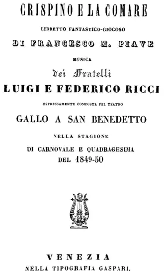 Crispino e la comare o Il medico e la morte (The Cobbler and the Fairy or The Doctor and Death) is an opera written collaboratively by Luigi Ricci and Federico Ricci with an Italian libretto by Francesco Maria Piave.