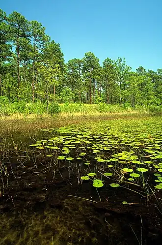 The Croatan National Forest lies completely within the Middle Atlantic coastal forests ecoregion.[8] It is home to a huge variety of marine and terrestrial animals. Some of the wildlife that can be found include black bear, raccoon, squirrel, bobcat, river otter, muskrat, mink, a wide variety of reptiles and amphibians, as well as osprey, peregrine falcon, various species of owls, quail, bald eagle, wild turkey, and alligator. The forest is abundant with pine trees including virgin longleaf pine stands that remain untouched to this date. There are many hardwood areas including the cypress trees of the swamps. Carnivorous plants such as Venus flytraps, sundew, and pitcher plants may also be found. There are a few sandy areas within the forest that provide pristine habitat for the eastern diamondback rattlesnakes. The tannic-stained blackwater present throughout the forest also gives habitat to several unique species of fish who thrive in the forest's unique riverine conditions. Species such as bluespotted sunfish, mud sunfish, banded sunfish, eastern mudminnow, flier, warmouth, redfin pickerel, bowfin and yellow bullhead, among many others, are some of the most commonly encountered fish. The elusive swampfish, a species of cavefish, can also be found in several creeks and canals throughout the forest.