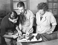 In 1937 Dr Harold Thompson was appointed as the first Officer in Charge of the Fisheries Investigations Section of CSIR, which was renamed the CSIRO Division of Fisheries and Oceanography in 1956.[2] The NSW Government's part holding of the Hungry Point site was transferred back to the Commonwealth in 1938 to accommodate the newly established CSIR Fisheries Division, and provision was made to also house the NSW Fish Biology Branch and students from Sydney University. Programmes were quickly developed in a wide range of research areas, initially related to tuna, whales and dolphins, coastal and estuarine hydrology, fish preservation, mullet and oysters. Subsequent decades saw the rapid expansion of research programmes in physical and chemical oceanography, fish biology, population dynamics and plankton research.[2] The CSIRO Fisheries main building (Building 1) was completed in 1938.[20][2]