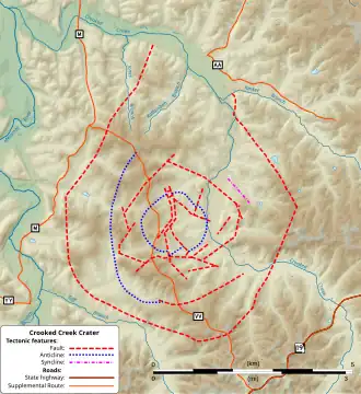 ![]() Faults and other tectonic structures related to the Crooked Creek crater on a shaded relief map | |