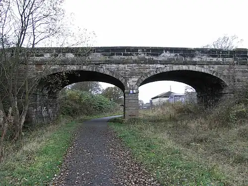 Crosshouse and its four platforms served as a junction station, allowing travel to Kilmarnock from the directions of both Irvine and Dalry.[2] The Irvine service was withdrawn on 6 April 1964,[3] with the station closing permanently to passengers on 18 April 1966,[4] although the line was still in use by freight trains and diverted passenger trains until 23 October 1973.[2]