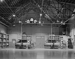 The turbine building was modified to take more equipment, resulting in a rearrangement of the walls to enlarge it and addition of a gable to it, similar in appearance to that on the generator building. It has a much higher floor than the generator building and received a pair of vertical turbine/generator sets.[14]