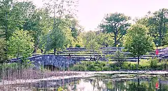 Crotona Park contains a 3-acre (1.2 ha) pond called Indian Lake.[105] According to NYC Parks, the name supposedly comes from 19th-century youths who lived in the area and "envisioned Weckguasgeeck Indians sitting around the lake on the ledge of the rock surrounding their chief, who would be smoking the legendary peace pipe with newly-arrived Europeans seeking land to settle".[17] The pond is also popularly called Crotona Lake.[17][105] Historically, Indian Lake drained into Bungay or Bound Brook, which then flowed south to the East River near what is now Hunts Point.[106][107] An amphitheater is at the southern shore of the lake, adjacent to a stone bridge that spans an inlet at the lake's extreme south end.[72] The lake is inhabited by ducks, turtles, and fish. The surrounding area contains numerous native floral species including tulip, black cherry, hickory, sassafras, and sweetgum.[10] As of the 2015 master plan, the lake had become overgrown with algal blooms and contained excessive litter due to its proximity to picnic areas.[86]