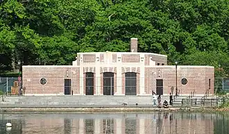 Adjoining the lake's eastern shore is a nature center, a brick structure that opened in 2001 and formerly served as a boathouse.[58] The boathouse was built in either 1928[18] or the 1940s,[17] replacing a wooden structure erected in the early 20th century.[18][17] The nature center sponsors outdoor activities such as nature walks, species identification, and summer camps.[108]