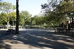 The park did not receive many improvements until the 20th century.[14] Indian Lake's perimeter was paved in the early 1900s, and an ice-skaters' concession stand and a warming hut were installed.[17] In addition, landscaping work was performed, and a new grandstand for concerts and ball games was erected.[14] Three hundred American elms were planted around the lake in 1903.[13][18] Two years later, an athletic field for the New York City Department of Education was built.[19] A bill was introduced in the Assembly in 1909, which would install a New York National Guard armory in Crotona Park.[20] The bill was heavily denounced by the public,[21] and though both the Assembly and Senate passed the bill,[22][23] mayor George B. McClellan Jr. vetoed it.[24] Crotona Park was expanded via land acquisition in 1907 and 1911,[14] and extra tennis courts were added in 1915.[25] A concrete wall around the lake's perimeter, as well as lamps and paths, were installed in 1914.[17] A "farm garden", to teach children about farming, was added in 1928.[18]