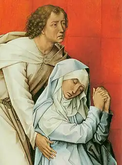 Art historian Penny Howell Jolly was the first to propose that the diptych was painted for an unnamed Carthusian monastery.[7] Carthusians lived a severely ascetic existence: absolute silence, isolation in one's cell except for daily Mass and Vespers, a communal meal only on Sundays and festival days, bread and water on Mondays, Wednesdays and Fridays, clothes and bedding of the coarsest materials.[8] Van der Weyden's son Cornelis entered the Carthusian Monastery of Herrines about 1449, and was invested in the order in 1450.[9] The artist donated money and paintings to the order during his lifetime, and made a bequest to it in his will.[10] His only daughter Margaretha became a Dominican nun.[11] Art historian Dirk de Vos describes the diptych as a "monastically inspired devotional painting" whose composition was "largely determined by the ascetic worship of the Carthusians and Dominicans."[12]