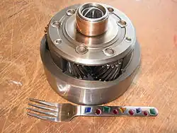 Ravigneaux planet carrier from a Ford FMX, with a dinner fork to show scale