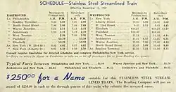 A contest was held to find a name for the new train, offering a $250 cash prize (equivalent to $5,468 in 2024) to the winner. The Crusader, the entry of Mr. P. W. Silzer of Plainfield, New Jersey, won the prize, selected by a committee of 29 railroad officials from among 6,086 suggestions.[6] The Crusader's first regular run was on December 13, 1937.[3] The train was scheduled to make two round trips six days a week; Sundays were reserved for maintenance work.