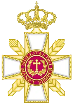 Two classes of the Cruz Fidélitas also exist, which can only be awarded to non-chaplains. These are the Cruz de Honor de la Cruz Fidélitas (English: Cross of Honor of the Fidelity Cross), awarded for constant or highly effective service to the archbishopric, and the Gran Cruz de la Cruz Fidélitas (English: Grand Cross of the Fidelity Cross), awarded for exceptional and valuable service.[1]