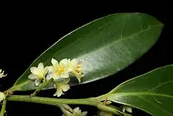 Cryptocarya laevigata, commonly known as red-fruited laurel, glossy laurel or grey sassafras,[3] is a species of flowering plant in the family Lauraceae and is native to Malesia, New Guinea and eastern Australia. It is a shrub or tree with lance-shaped to elliptic leaves, creamy white, pale green and perfumed flowers, and more or less spherical, red to orange-yellow drupes.
