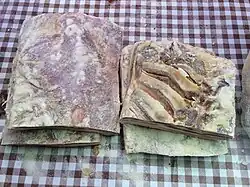 Carmarthen Market also sells home-made brawn, sausages, pork pies, and faggots.[1] Faggots can be bought at Ettie Richardson's Home Baking stall, which sells them fresh every Wednesday, Friday and Saturday.[3] A & G Williams of Felinfoel produce traditional Welsh faggots and other savoury products.[8] Brawn is a traditional Carmarthenshire dish, and one Carmarthenshire recipe includes pig's head and trotters which are rubbed well with salt and then placed in a crock and left for 2 or 3 days. The meat is then washed in cold water, placed in a boiler pan, brought to the boil and then simmered for 3–4 hours until the meat leaves the bone. The meat is then minced with onions, sage and pepper and then, the liquor strained, and then the mixture simmered for about 15 minutes and then left to cool.[16]
