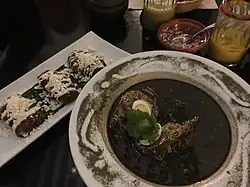 Like most of the rest of Mexican cooking, the cuisine of Chiapas is mostly a blending of indigenous and Spanish ingredients and cooking techniques. Chiapan cooking is still heavily influenced by the indigenous, especially the use of native herbs such as chipilín, a fragrant, thin leaved plant used most often in tamales and soups and hoja santa, which is used in much of southern Mexican cooking.[1][2] The cuisine is based on the Mesoamerican staple of corn, most often found in tortillas and tamales, but also in a number of preparations including drinks. Other indigenous ingredients include chili peppers, cacao beans, beans, avocados and an edible flower called “cuchunuc” .[1][3] A number of wild plants are still eaten including radishes, mustard, sour tomatoes and a variety of mushrooms.[3] Cacaoite, is a seed which is ground to along with those of squash and to make sauces.[2] In rural areas, meats such as armadillo, tepezcuintle, iguana, wild boar, rabbit, and various native birds are still eaten.[3] Chiapas cuisine favors black beans, although some areas such as San Juan Chamula consume a variety.[4][1] Beans are generally prepared simply just with salt and chili pepper, generally without fat.[4]
