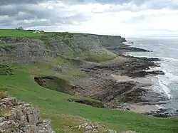 Laverbread (Welsh: bara lawr) is made from the seaweed porphyra umbilicalis.[11] The seaweed is purplish-black and found strewn throughout the intertidal area of Gower, particularly the upper levels. It is more common in the winter period, from late autumn onwards, where the rocks are near, or overlain with, sand. This seaweed can be found on most of the rocky beaches of Gower; it appears to be in greater volume, probably because it is less frequently collected for laverbread than before.[11] Traditionally, it is boiled for hours to render it into a thick puree. It is sold in Swansea Market but, if gathered fresh, it can be deep-fried into tasty crisps.[3] Other recipes include laverbread breakfast cake, laverbread and cockle pâté, laverbread with streaky bacon, and laverbread with mashed potato.[12] There are still some small producers of Gower laverbread, but larger quantities are sourced from the west coast of Scotland.[13] A Gower breakfast can comprise griddled bacon with cockles, laverbread and baked eggs.[14]