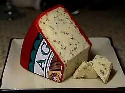 Up until the 18th century large goat herds provided milk for cheese and there has been a revival in the production of goat cheese since the twentieth century, particularly around Abergavenny. .[77] Pantysgawn Farm produces a soft goat's cheese based on an old recipe called Pantysgawn. The farm also produces St Illtyd Cheese, a mature cheese made with garlic, white wine and herbs; St David's Cheese, a continental-style washed-rind cheese; and Y Fenni cheese, a mature cheese milled with ale and mustard seeds.[78] Rees writes that Y Fenni Cheese has a tangy mustard flavour, moist texture and pale-yellow colouring. It is coated with wholegrain mustard seed and Welsh ale and preserved in a cream-coloured wax.[79] Davies refers to a recipe called Breast of Chicken filled with Y Fenni Cheese, where this cheese is used as a stuffing with parsley [80]