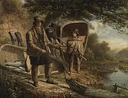 The Severn Estuary and the estuaries of the Usk and Wye were also fished using lave nets. These are Y-shaped nets consisting of a handle and two arms from which the net is hung.[45] Clenching nets are another type of net used on the Wye, these resemble a hand net which is hung at the end of a long pole.[46] Stop-nets are another type of net which are used along the Severn and Wye from boats which are anchored to withstand the force of the tide.[47] Coracle fishing also took place on the Severn, Usk and Wye but ended in the 1930s[48] The coracle used on the Usk and Wye was known as the Monmouthshire truckle and was similar in design to the Tywi coracle.[49] On the Severn, three types of coracle were used: the Ironbridge coracle, the Shrewsbury coracle and the Welshpool coracle.[50] Drift netting and seine fishing also took place on the lower, wider stretches of these three rivers, where the current is stronger.[51]