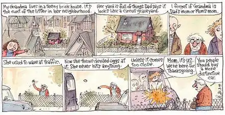 I thought the best newspaper comic strips were long gone, and I've never been happier to be wrong. Richard Thompson's Cul de Sac has it all—intelligence, gentle humor, a delightful way with words, and, most surprising of all, wonderful, wonderful drawings. Cul de Sac's whimsical take on the world and playful sense of language somehow gets funnier the more times you read it. Four-year-old Alice and her Blisshaven Preschool classmates will ring true to any parent. Doing projects in a cloud of glue and glitter, the little kids manage to reinterpret an otherwise incomprehensible world via their meandering, nonstop chatter. But I think my favorite character is Alice's older brother, Petey. A haunted, controlling milquetoast, he's surely one of the most neurotic kids to appear in comics. These children and their struggles are presented affectionately, and one of the things I like best about Cul de Sac is its natural warmth. Cul de Sac avoids both mawkishness and cynicism and instead finds genuine charm in its loopy appreciation of small events. Very few strips can hit this subtle note.