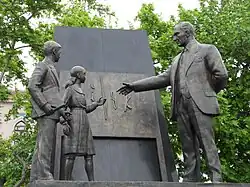 One key element of Soviet propaganda was interaction between Stalin and the children of the Soviet Union. He was often photographed with children of different ethnic backgrounds of the Soviet Union and was often photographed giving gifts to children. In 1935 the phrase, "Thank You, Dear Comrade Stalin, for a Happy Childhood!" started to appear above doorways at nurseries, orphanages, and schools; children also chanted this slogan at festivals.[150] Another key element of Soviet propaganda was imagery of Stalin and Lenin. In many posters, Stalin and Lenin were placed together to show their camaraderie and that their ideals were one. Throughout the 1930s, posters with both images were used as a way to bring the nation and the military together under the policies of the Communist Party during World War II, with the idea of Lenin as the father of the revolutionary ideas and Stalin as the disciple who would fulfill the communist ideals.[145] Stalin was also portrayed in numerous films produced by Mosfilm, which remained a Soviet-led company until the fall of the Soviet Union.