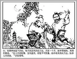 When Zhou asked for his name, he was delighted to learn Wu Song was the same fellow who became famous for killing a man-eating tiger with his bare hands on Jingyang Mountain in Shandong province the previous year. When Wu learned who Zhou Tong was, Wu immediately dropped to his knees, knocked his head on the floor and pleaded to become his student. Wu was thrilled to meet this old generation master who was famous throughout the rivers and lakes for his skill in military and civilian martial arts. Zhou helped Wu up and began to teach him the "Rolling dragon" style of swordplay under the moon.[25][26]