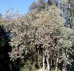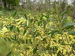 The grassy woodland is dominated by Grey Box (Eucalyptus moluccana) and Forest Red Gum (E. tereticornis), with Narrow-leaved Ironbark (Eucalyptus crebra), Spotted Gum (Corymbia maculata) and Thin-leaved Stringybark (Eucalyptus eugenioides) occurring sporadically. The ecoregion may have an open layer of small trees that would include such species of Acacia decurrens, Acacia parramattensis, Acacia implexa and Exocarpos cupressiformis.[26] The shrub layer is mainly contains Bursaria spinosa, indigofera australis, Hardenbergia violacea, Daviesia ulicifolia, Lespedeza cuneata, Dillwynia, Dodonaea viscosa, with plenty grasses such as Kangaroo Grass (Themeda australis) and Weeping Meadow Grass (Microlaena stipoides).[27]