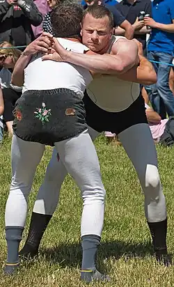 The traditional costume consists of long johns and an embroidered vest with a velvet centre piece over the top. Matches are usually decided by the best of three falls.