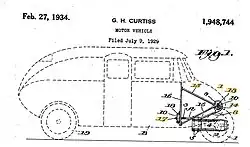 A Curtiss patent (US 1948744[70] filed on 9 July 1929 and approved on 27 February 1934) supported by archive material at the Glenn H. Curtiss Museum suggests that just before his death Curtiss conceived of a radical front-wheel drive "house car" (now motorhome) that would carry the Aerocar name. Called simply The Curtiss Motor Vehicle it was an early form of small but aerodynamic motorhome or camper van. Its one-box design pre-dated the 1950 Volkswagen Kombi by over 20 years. It included the articulated suspension of The Curtiss Automotive Vehicle but incorporated a smaller engine and larger passenger compartment. Only one rudimentary prototype is known to have been built.