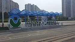 In 2017, Tongil News reported the introduction of a bicycle-sharing system in Pyongyang, called Ryomyong (려명 "Dawn"), sharing photographs from the Russian embassy.[6] The Pyongyang Times later published photographs of stations, reporting that the system is overseen by the Pyongyang Bicycle Rental Office (평양자전거임대관리소), with bicycles manufactured domestically by a North Korean/Chinese joint venture, Phyongjin Bicycle Cooperative Company (평진자전거합영회사), located in Sosong district (서성구역). Reservations may be made for 50 won per minute with a stored-value card at one of five locations on Kwangbok Street in the city's scenic Mangyongdae district.[7]