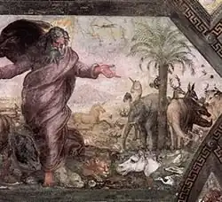 "Creation of the animals" by Raphael, 1518–1519, a fresco on the second floor of the Palazzi Pontifici in the Vatican. A rhinoceros appears to the right of the tree, with an elephant [possibly Hanno] to the left.