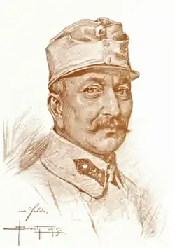 Under the recommendation of General Karl von Pflanzer-Baltin, he took command of Colonel Fischer Group on 1 January 1915.[2] The reorganized brigade was later called the "Papp Brigade" and was integrated into the XI. Army Corps. During the first half of 1915, the brigade had 4,723 soldiers, 386 horses, 14 heavy machine guns, and several artillery guns of various calibers including 30.5 cm howitzers. The number of soldiers was increased to 6,800 by autumn with soldiers coming from Landsturm units, Imperial infantry, as well as volunteer and Hussar units.[5]