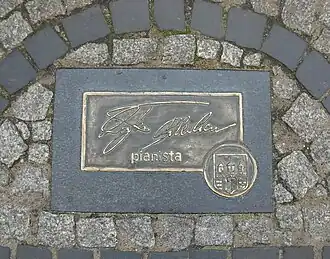 Bydgoszcz Autographs alley is a collection of relief signature embedded into the pavement of Długa street, between the streets Jan Kazimierz and Stefan Batory streets. These granite plaques display Polish meritorious men and women. This theme avenue is the result of a competition run in 2007, aiming at creating new attractions in Bydgoszcz. The competition gathered 123 proposals, the City Hall council settled the contest in November 2007: the author of the winning idea of Bydgoszcz's Autographs alley was Halina Piechocka-Lipka, director of the cultural department of Bydgoszcz.[17] Local artist Michał Kubiak designed the plaques, nominated names are chosen by a committee comprising among others municipality members and university officials.