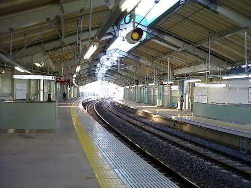 The station consists of two elevated opposed side platforms connected via an underpass to the station building underneath.
